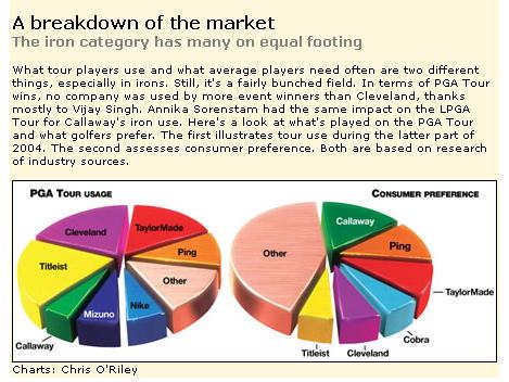下のグラフはPGAツアー選手を対象に使用クラブメーカーを調査したもの(左のグラフ)と、一般市場で購入されたクラブメーカーごとの割合(右のグラフ)を示したグラフです。