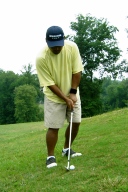 クラブは斜面の傾斜に沿って、テイクバック→フォローと出します。右足体重なので自然とフォローは高くなります。ボールも高く飛び出しますのでそのイメージを描いてくださいね。←このイメージが大事!