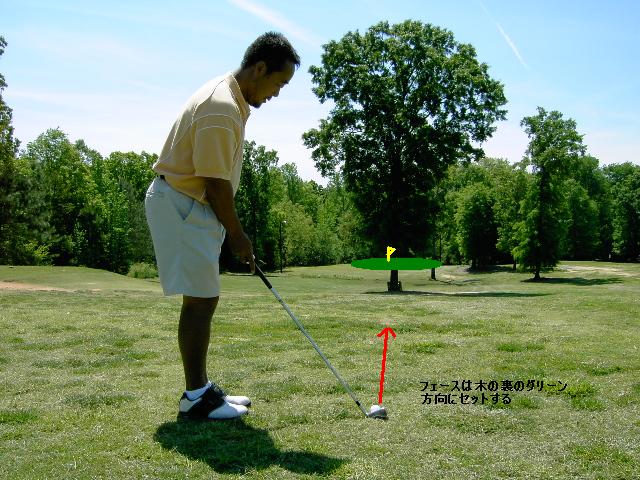 @クラブフェースをボールを最終的に打ちたい目標方向に向けてセットします。ここでは木の真裏にあるグリーンに向けてセット。