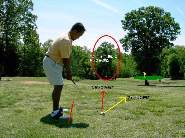Aクラブフェースを@でセットした方向に向けたまま、スタンスはボールを打ち出したい方向にとります。ここでは前方の高い木の左側に向きます。具体的には赤丸で囲んだ木を目標にして立ちます。