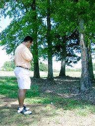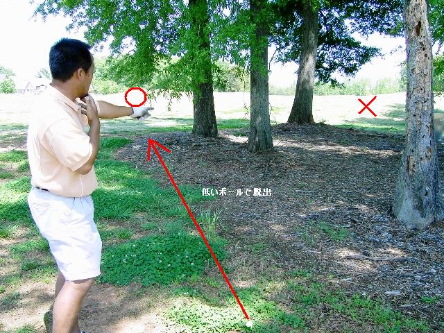 次に脱出できる空間を探します。@ABのいろんな条件があって脱出できる空間がかなり絞られると思います。また、脱出にはボールをできるだけ上げないで、低いボールで脱出するイメージを持ってください。そのほうが成功する確率が高いです。具体的にこの写真の状況でどうするか説明しますね。これはティーショットをプッシュしてしまい右の林に入れたところです。