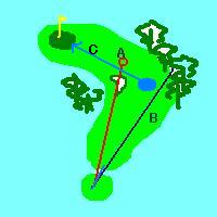 もう皆さんご存知のとおりドッグレッグホールのドッグレッグ(DOGLEG)とは急角度に曲がった道(フェアウェイ)のことを言いますね。文字通り犬の足の形をしたホールと言うことです。 (モデル:REXプロの愛犬イーグル)ドッグレッグホールでのティーショットで陥りやすいミスは、コーナーの林に突っ込んだり、安全に行き過ぎて距離を残しすぎたりすることです。 ドッグレッグホールのゲームプランで考えることはこの4つ。 1.内コーナーを越えるための距離Aと外コーナーまでの距離Bの把握。 2.自分の飛距離が内コーナーを越えて最短距離に打つことができるのか。 3.内コーナーを越えるリスクを負うことによって何かいいことがあるのかどうか。 4.安全にいった場合(外コーナーを突き抜けない距離でフェアウェイセンターを狙うこと)、残りの距離Cがどれだけ残るのか。 アベレージゴルファーにはやはりフェアウェイセンターへの安全な攻め方を推奨します。このとき注意することは外コーナーを絶対に突き抜けないクラブを選択すること。そしてねらい目は、センターから外コーナーフェアウェイです。ショートカットへの未練は頭の中から完全に消して(←これけっこう大事!)安全なポイントへのターゲット意識をしっかりと持ちます。 かなり練習を積んだローハンデのプレーヤーでも、やはりショートカットは高い技術がいりますしリスクがつき物です。安全にフェアウェイセンターにボールを運んだとき残りの距離Cがミドルorショートアイアンで打てるならあえてショートカットをする必要もありません。よほど、ショートカットでグリーンそばまでボールが運べてバーディがとれる確率が高くなるならGO!迷いは捨てて打つのみです。 |