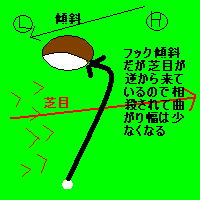 | 傾斜を読んだら、次は芝目をチェックしましょう。 最近はベントグリーンが増えたので、以前の高麗グリーンやバミューダグリーンに比べたら芝目の影響は少なくなっていると思います。それでも芝は生き物ということを覚えて置いてください。多かれ少なかれ影響は受けるはずです。 普通、芝目は水の流れる方向、つまり高いところから低いところに向きます。あるいは、太陽の光が当たる方向に向きます。 そして、ボールは順目では速く転がり、逆目では反対に遅くなりますね。 実際の自分の目で確かめる方法は、もう皆さんご存知ですね。 ▲自分のボールの後ろからカップに向かって見た時と、反対にカップからボールを見たときに芝が白く光って見える(順目)か、濃い緑色に見える(逆目)のかチェックします。 ▲カップがグリーンの四隅に切ってあるときはすぐそばのグリーンエッジの芝の生え方はけっこう参考になります。芝が長いので判断しやすいですよね。 ▲カップのふちを見るのもいいでしょう。 下の写真のようにカップの一部の切り口が汚くなっているときがあります。その反対側は大抵きれいな切り口です。この場合は切り口のきれいなほうから汚いほうに芝目が向いていると推測できます。 ![]() こうして傾斜と芝目を読んだら、それらを総合してラインを判断します。 のぼりの逆目は非常の重く、反対に、下りで順目だとすごく速くなります。 傾斜はスライスラインだけど、芝目がその逆ならスライスする曲がり幅が少なく、反対に目が左からきていたらスライスする度合いが大きくなる・・・という具合です。 (例) ![]() いろんな状況を経験してラインを読む自分の目を養ってください^^。